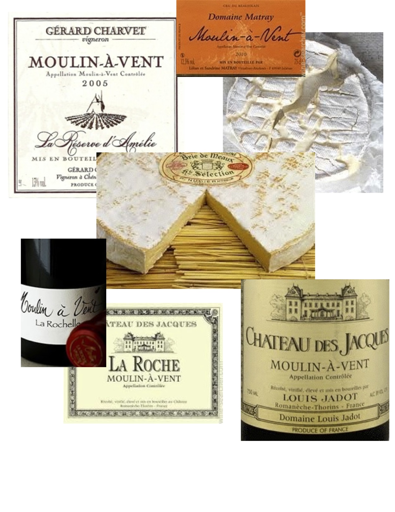 El maridaje prefecto es sin duda un Moulin-a-vent y Brie.  La cremosidad del brie se mezcla muy bien con vinos generosos como el Moulin-à-Vent. Las especias y notas a fruta madura que se logran después de pocos años de envejecimiento hacen el maridaje perfecto.